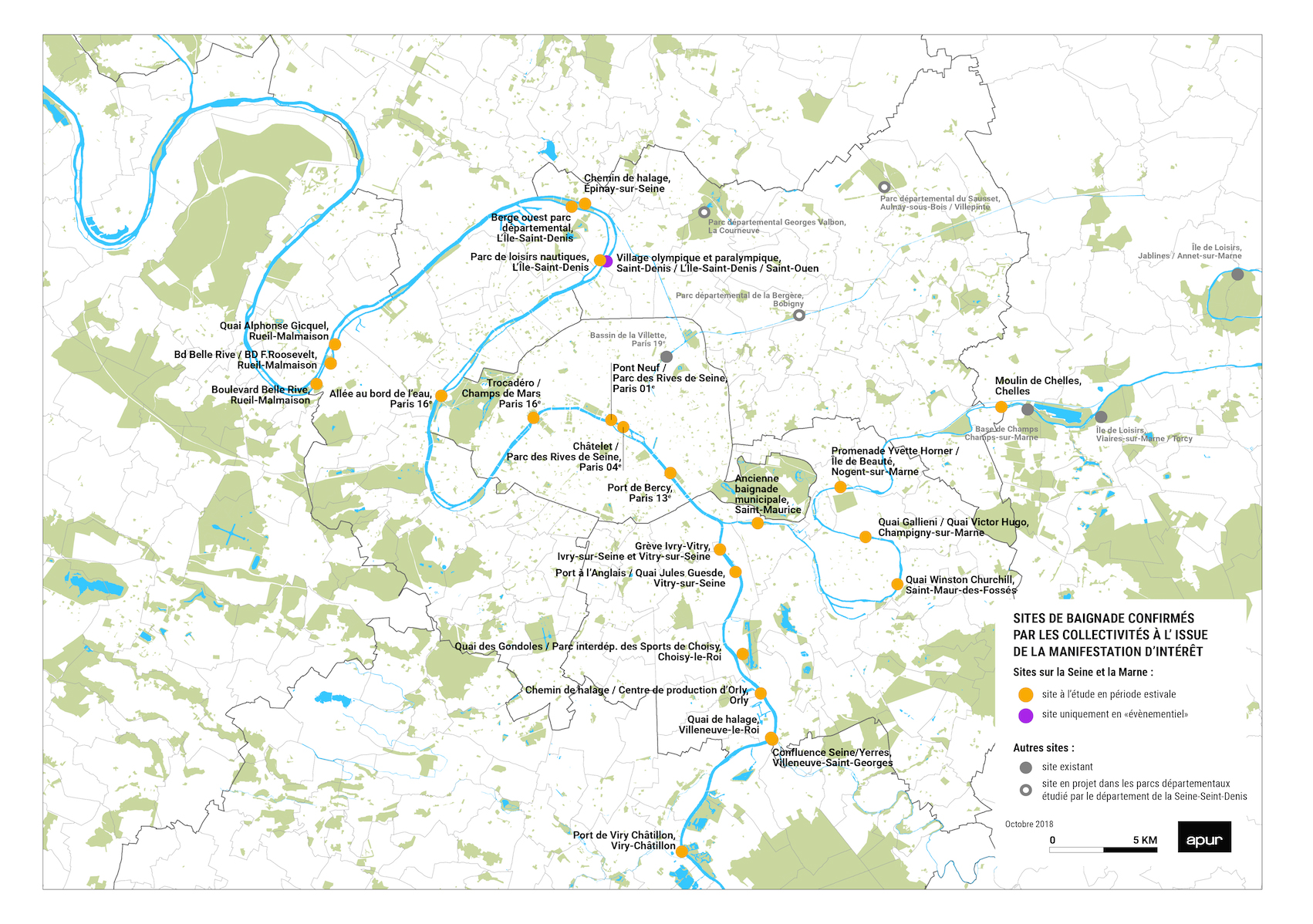Les partenaires du projet Baignade dans la Marne et la Seine (Mairie de Paris, Préfecture de Région Île-de-France, Métropole du Grand Paris, les départements du Val-de-Marne, de Seine-Saint-Denis et des Hauts-de-Seine, SIAAP) ont rendu publique la liste des sites métropolitains de baignade qui seront accessibles à partir de 2022 pour la Marne et de 2025 pour la Seine : 23 sites de baignade fluviale, auxquels s’ajouteront des sites sur le canal Saint-Denis ou le canal de l’Ourcq. Ces sites ont été retenus après une première analyse de faisabilité technique qui était indispensable pour dimensionner et entamer le plan d'action en matière d'amélioration de la qualité de l'eau et de définition des modalités d'ouverture des sites au regard des autres usages des cours d'eau (navigation, ports, loisirs, alimentation en eau potable, etc.). Toutefois, dans les années qui viennent d'autres communes pourront proposer des sites supplémentaires qui seront retenus en fonction de leur faisabilité technique.